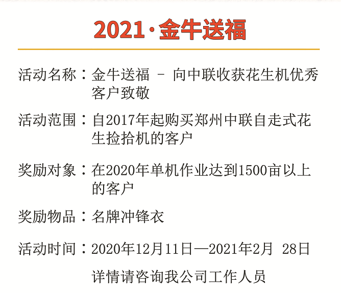 2021·金牛送福活动--向AG旗舰厅优质花生机客户致敬2021·金牛送福活动--向AG旗舰厅优质花生机客户致敬,郑州中联感恩回馈,财富满堂!